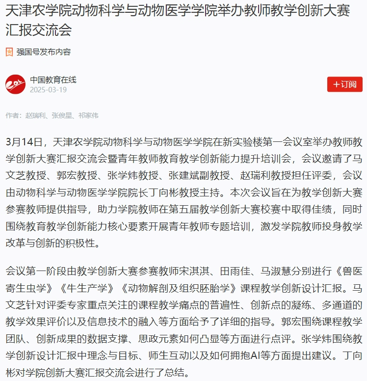 2025年3月19日,学习强国平台-中国教育在线、中国教育在线网报道,今年会官网动物科学与动物医学学院在新实验楼第一会议室举办教师教学创新大赛汇报交流会暨青年教师教育教学创新能力提升培训会。