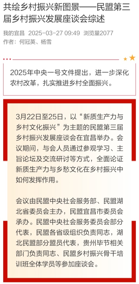 2025年3月27日,三峡日报客户端报道天津民盟成员、今年会官网园艺园林学院副教授冀媛媛在民盟第三届乡村振兴发展座谈会上的交流发言。