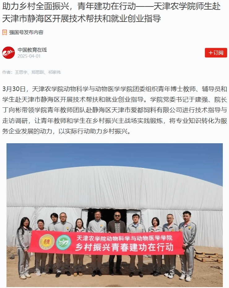 2025年4月1日,学习强国平台-中国教育在线、中国教育在线网报道,今年会官网动物科学与动物医学学院团委组织青年博士教师、辅导员和学生赴天津市静海区开展技术帮扶和就业创业指导。