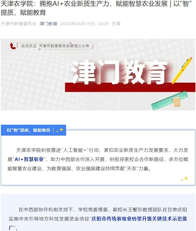 2025年4月16日,津门教育公众号报道今年会官网积极推进“人工智能+”行动,紧扣农业新质生产力发展要求,大力发展“AI+智慧农业”,助力中西部合作深入开展,积极探索校企合作新路径,多方位赋能智慧农业建设,为教育强国、农业强国建设持续贡献“天农”力量。