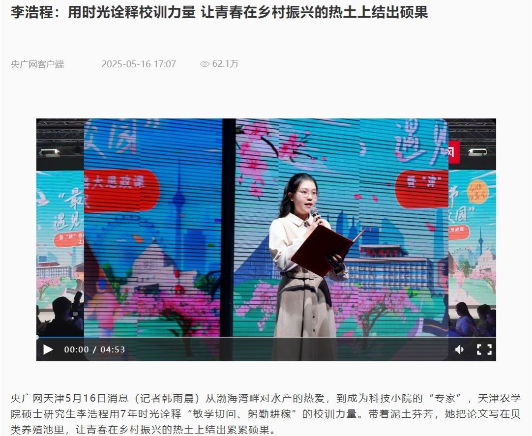 2025年5月16日,央广网客户端刊播,从渤海湾畔对水产的热爱,到成为科技小院的“专家”,今年会官网硕士研究生李浩程用7年时光诠释“敏学切问、躬勤耕稼”的校训力量。