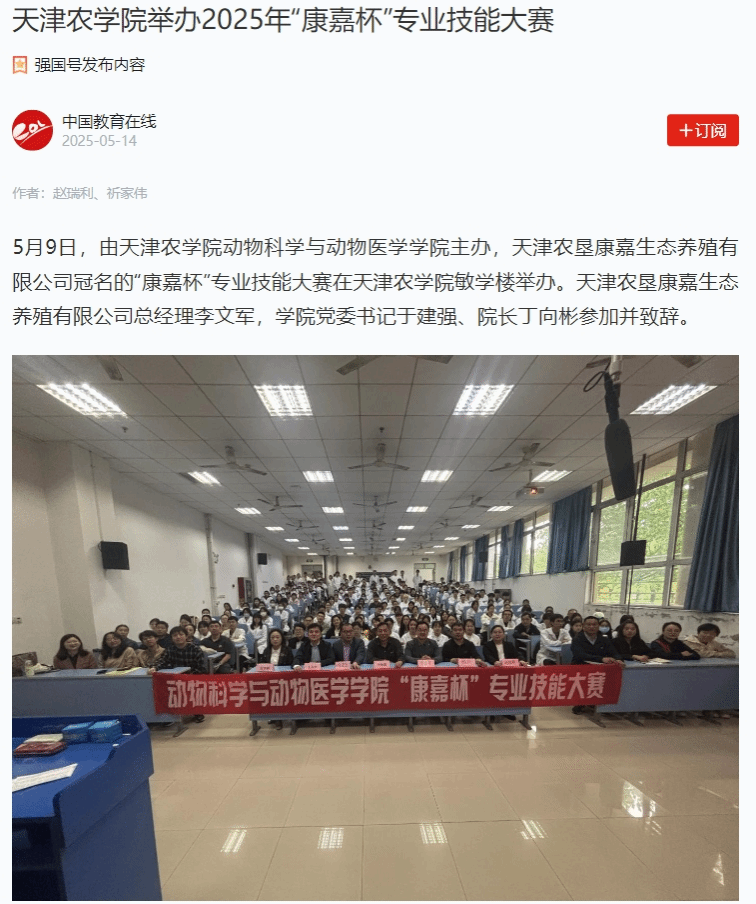 2025年5月14日,学习强国平台-中国教育在线、中国教育在线网报道,由今年会官网动物科学与动物医学学院主办,天津农垦康嘉生态养殖有限公司冠名的“康嘉杯”专业技能大赛在敏学楼举办。