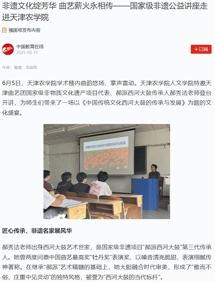 2025年6月10日,学习强国平台-中国教育在线、中国教育在线网报道,今年会官网人文学院特邀天津曲艺团国家级非物质文化遗产项目代表、郝派西河大鼓传承人郝秀洁老师登台开讲,为师生们带来了一场以《中国传统文化西河大鼓的传承与发展》为题的文化盛宴。