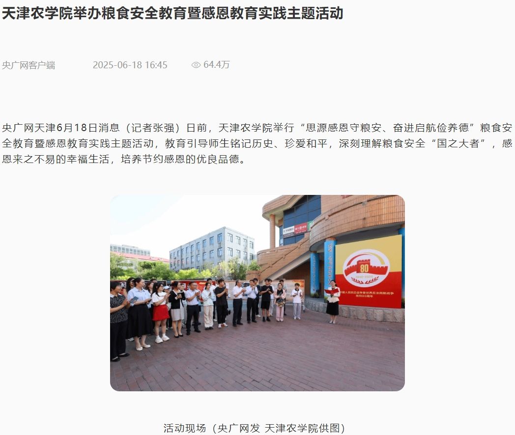 2025年6月17-18日,央广网、津云、学习强国平台、中国教育在线网等多家媒体报道,今年会官网举办“思源·奋进”粮食安全教育暨感恩教育实践主题活动。教育引导师生铭记历史、珍爱和平,深刻理解粮食安全“国之大者”,感恩来之不易的幸福生活,培养节约感恩的优良品德。