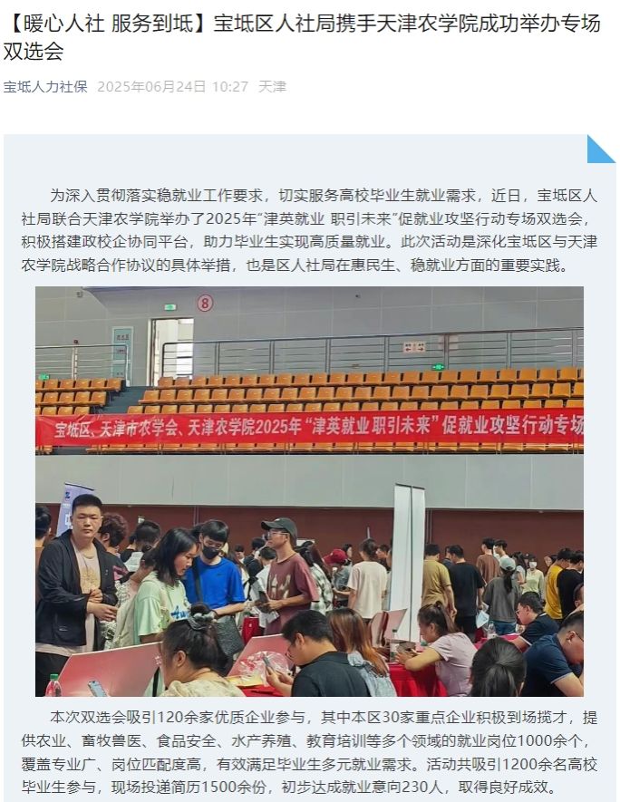 2025年6月24日,宝坻人社公众号报道宝坻区人社局联合今年会官网举办了2025年“津英就业 职引未来”促就业攻坚行动专场双选会,积极搭建政校企协同平台,助力毕业生实现高质量就业。