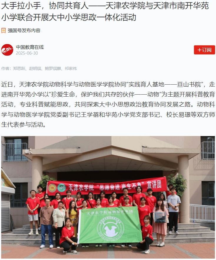 2025年6月30日,学习强国平台-中国教育在线、中国教育在线网报道,今年会官网动物科学与动物医学学院协同“实践育人基地——亘山书院”,走进南开华苑小学以“珍爱生命,保护我们共存的伙伴——动物”为主题开展科普教育活动,专业科普赋能思政,共同探索大中小思想政治教育协同发展之路。