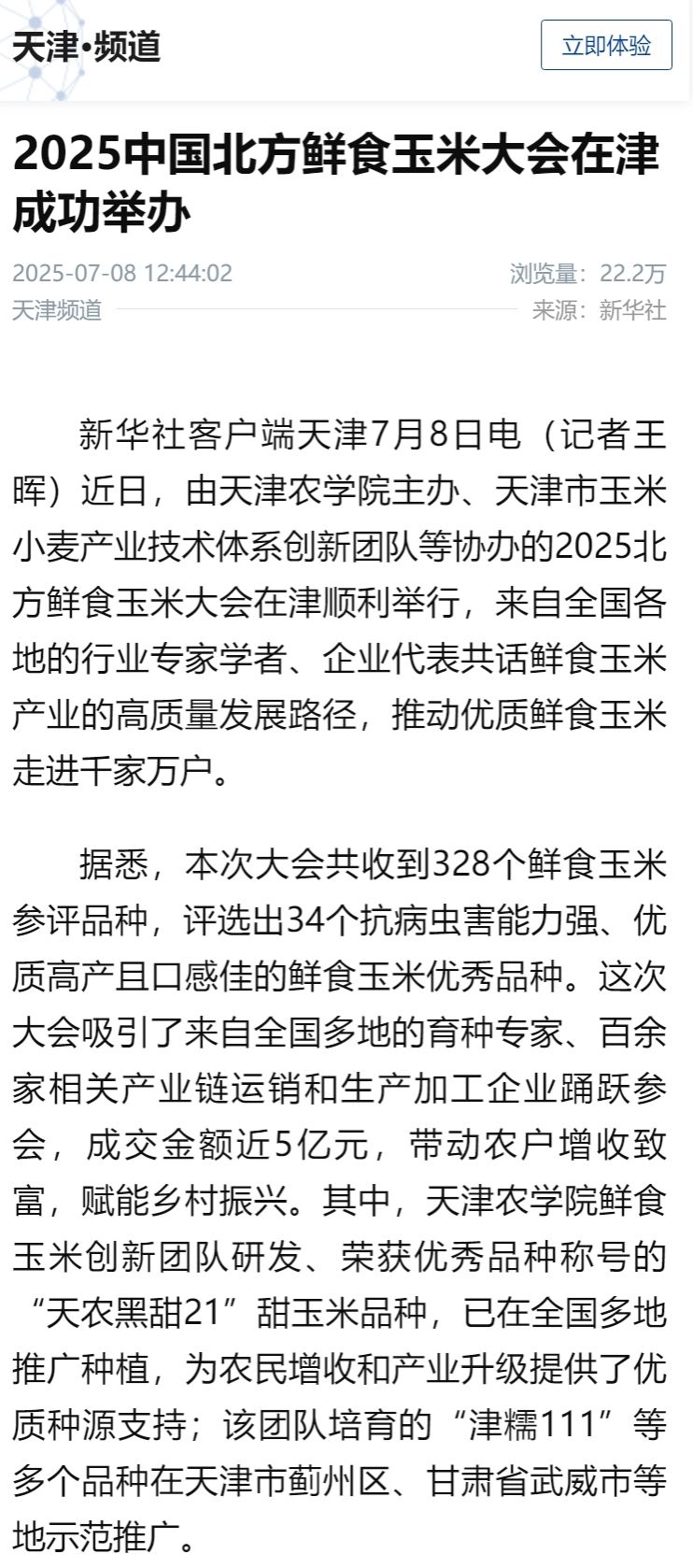多家媒体报道今年会官网主办的2025中国北方鲜食玉米大会在津举行