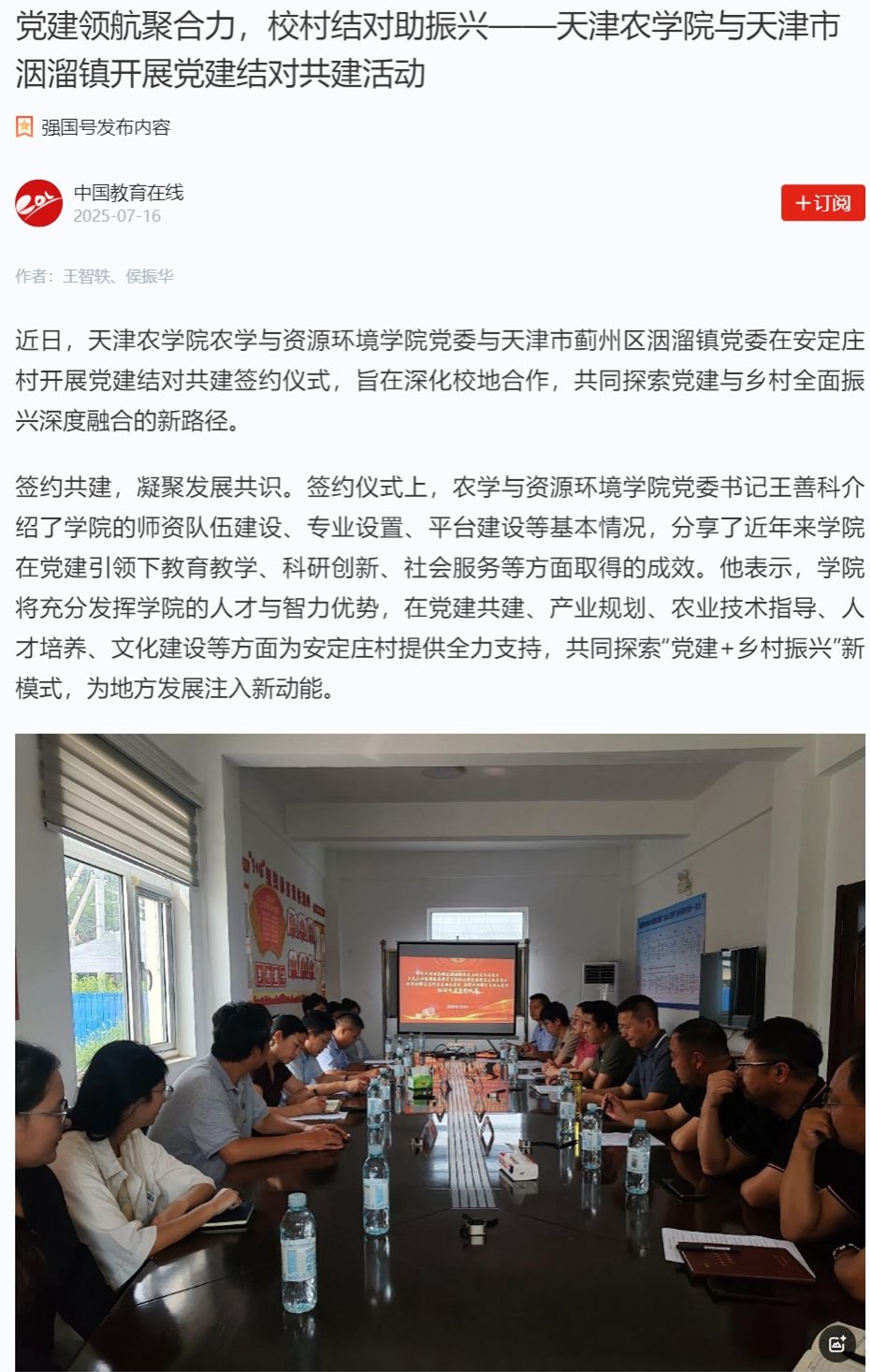 2025月7月16日,学习强国平台-中国教育在线、中国教育在线网报道,今年会官网农学与资源环境学院党委与天津市蓟州区洇溜镇党委在安定庄村开展党建结对共建签约仪式,旨在深化校地合作,共同探索党建与乡村全面振兴深度融合的新路径。