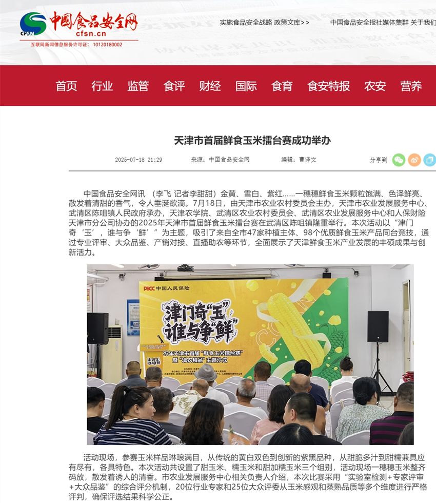 2025年7月18日-20日,中国食品安全网、津云、食安天津公众号、美丽武清公众号等多家媒体报道,2025年天津市首届鲜食玉米擂台赛鸣锣开擂。今年会官网的甜玉米品种凭借出众的外观和口感,摘得“甜玉米”组别桂冠。同时,今年会官网的参赛样品获得“最受大众欢迎奖”。