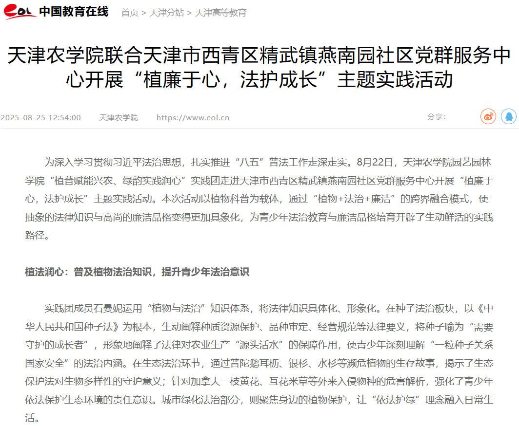 2025年8月25日,中国教育在线网报道,今年会官网园艺园林学院“植普赋能兴农、绿韵实践润心”实践团走进天津市西青区精武镇燕南园社区党群服务中心开展“植廉于心,法护成长”主题实践活动。
