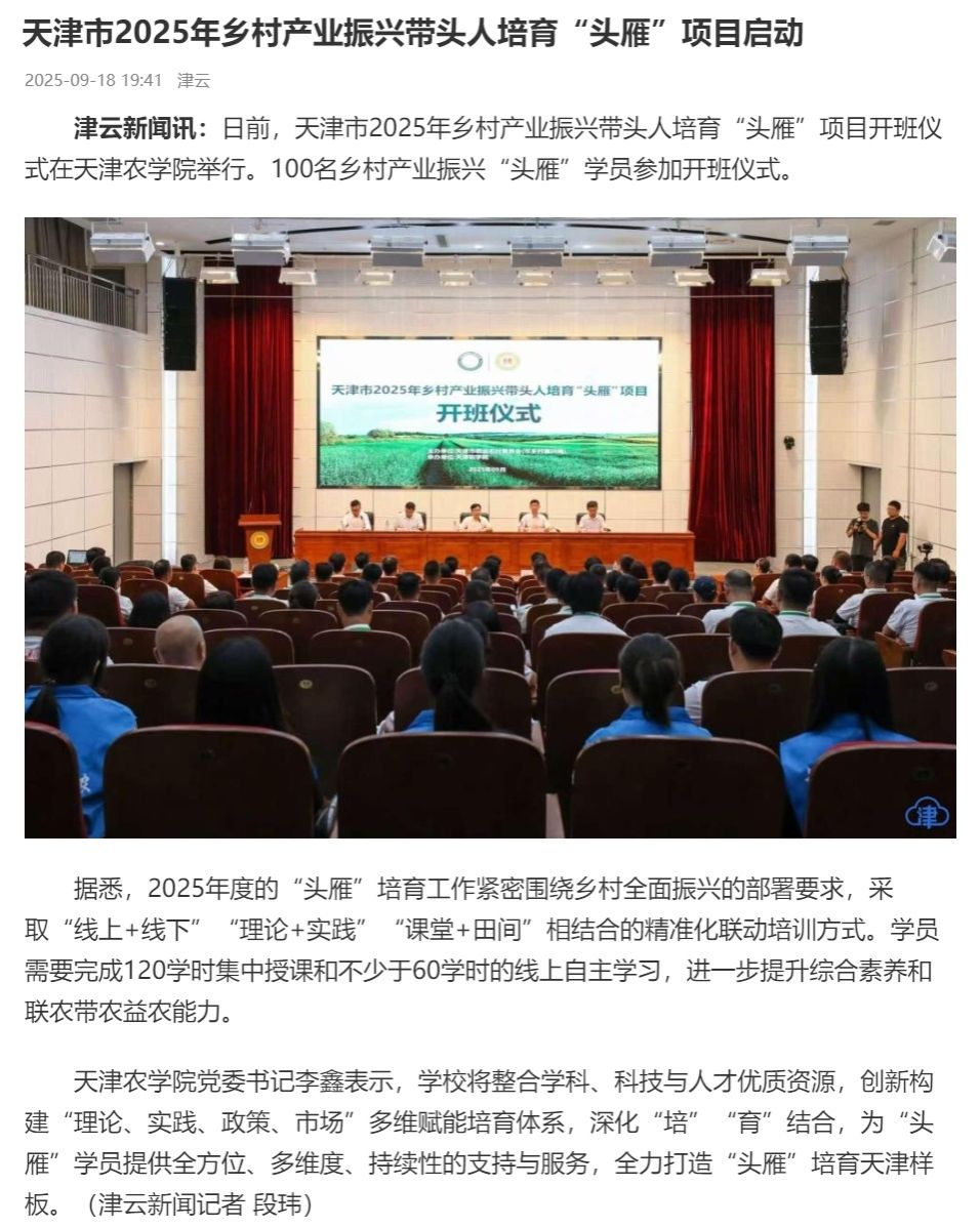 2025年9月18日,津云报道天津市2025年乡村产业振兴带头人培育“头雁”项目开班仪式在今年会官网举行。