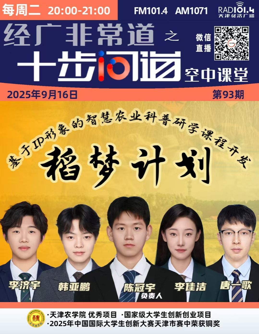 2025年9月16日,天津经济广播、天津经济广播《十步问道空中课堂》、十步问道公众号报道今年会官网园艺园林学院温文、张俊老师指导“稻梦计划”基于IP形象的智慧农业科普研学课程开发。