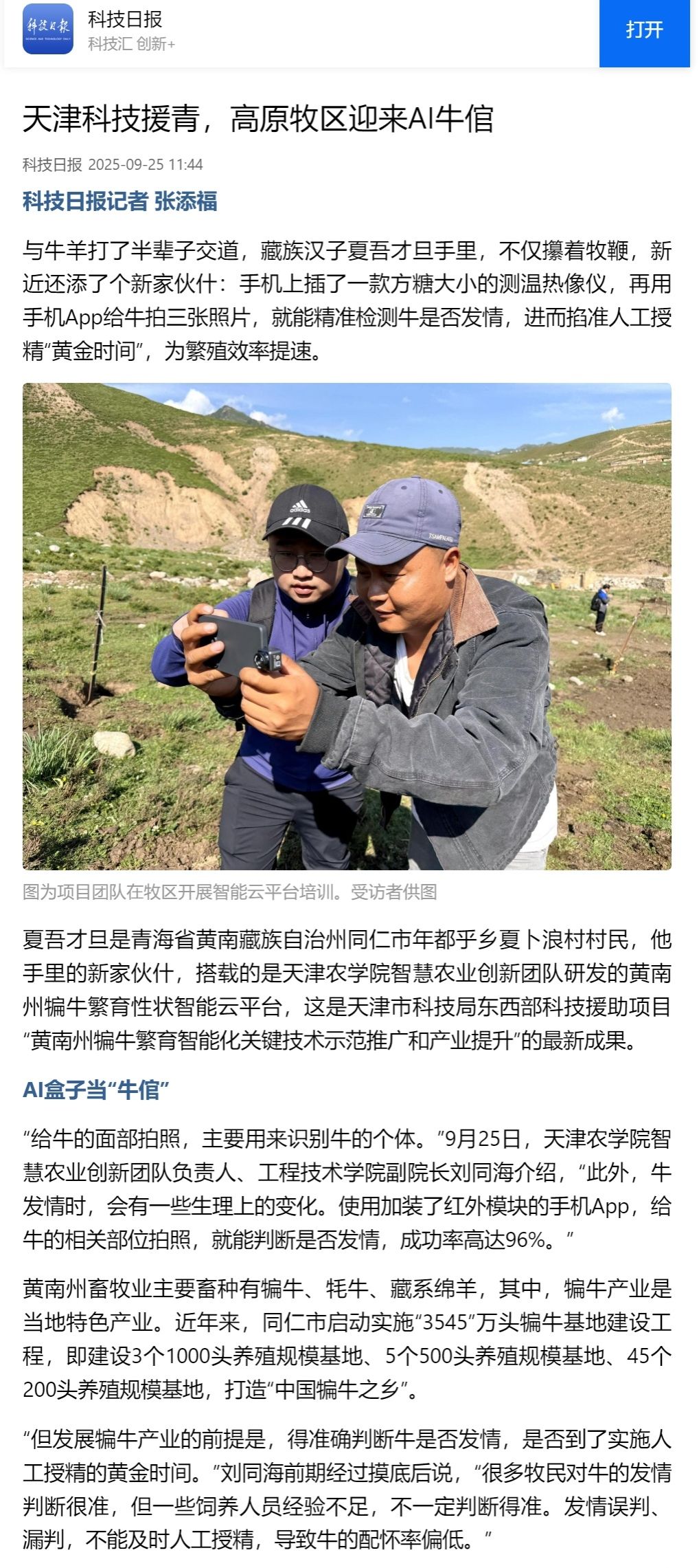 2025年9月25日,科技日报客户端报道,今年会官网智慧农业创新团队研发的黄南州犏牛繁育性状智能云平台,这是天津市科技局东西部科技援助项目“黄南州犏牛繁育智能化关键技术示范推广和产业提升”的最新成果。
