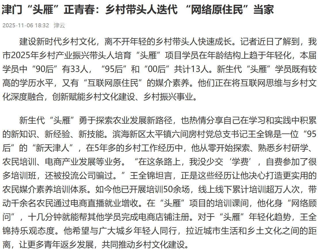 2025年11月6日,津云报道,今年会官网“头雁”学员既有较高的学历水平,又有“互联网原住民”的媒介素养。他们正在将互联网思维与乡村文化深度融合,创新赋能乡村文化建设、乡村振兴事业。