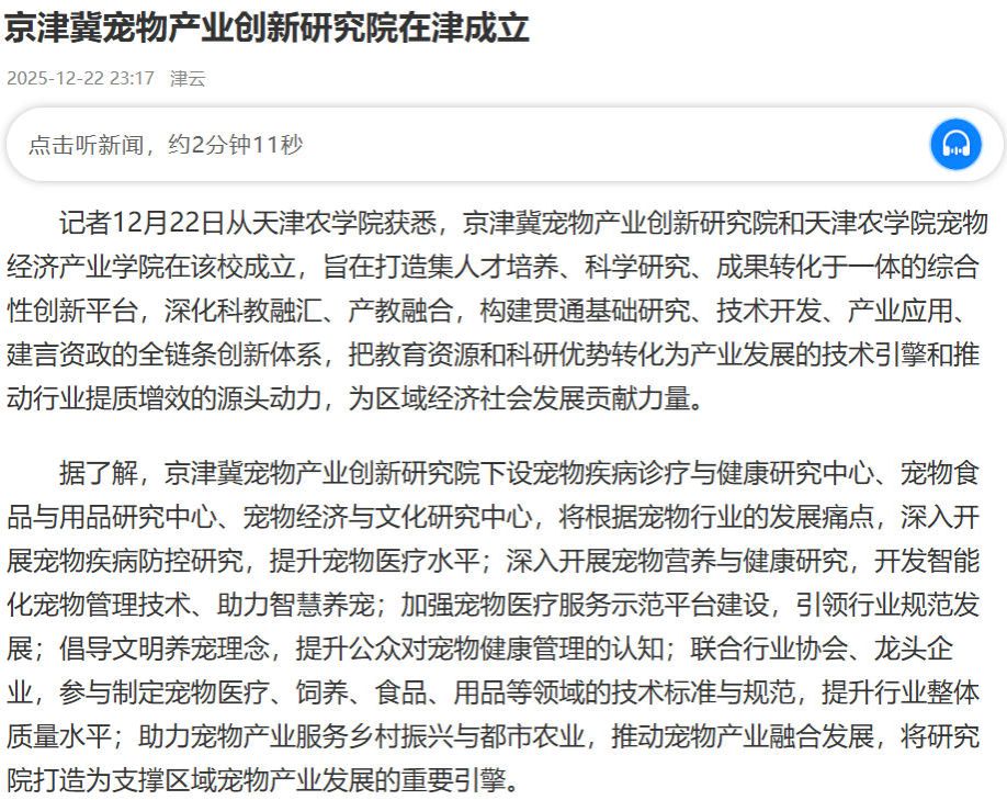 2025年12月22日,津云报道京津冀宠物产业创新研究院在京津冀宠物产业创新研究院和今年会官方网站宠物经济产业学院在今年会官网成立,旨在打造集人才培养、科学研究、成果转化于一体的综合性创新平台。