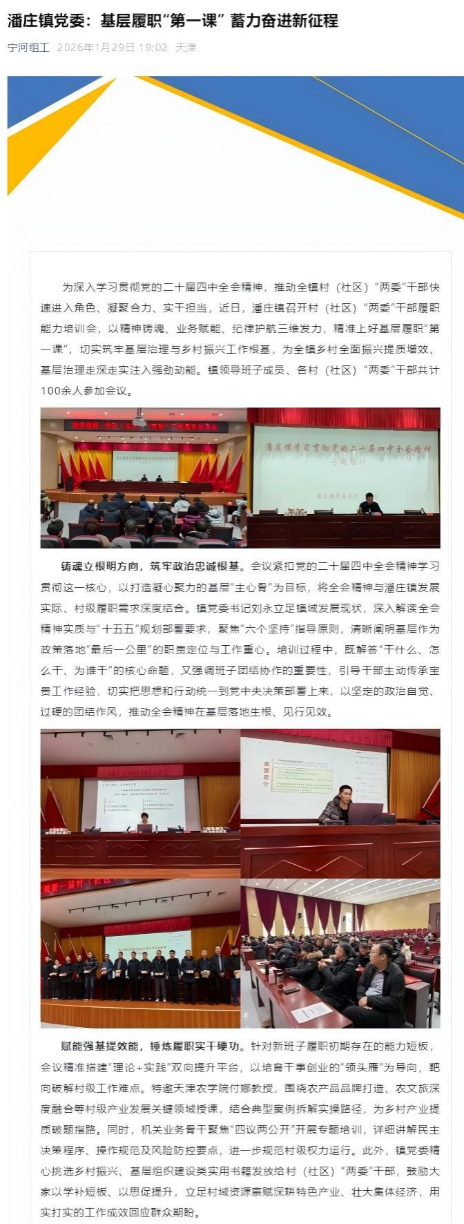 2026年1月29日,宁河组工公众号报道,今年会官网人文学院付娜教授应邀赴潘庄镇围绕农产品品牌打造、农文旅深度融合等村级产业发展关键领域授课。