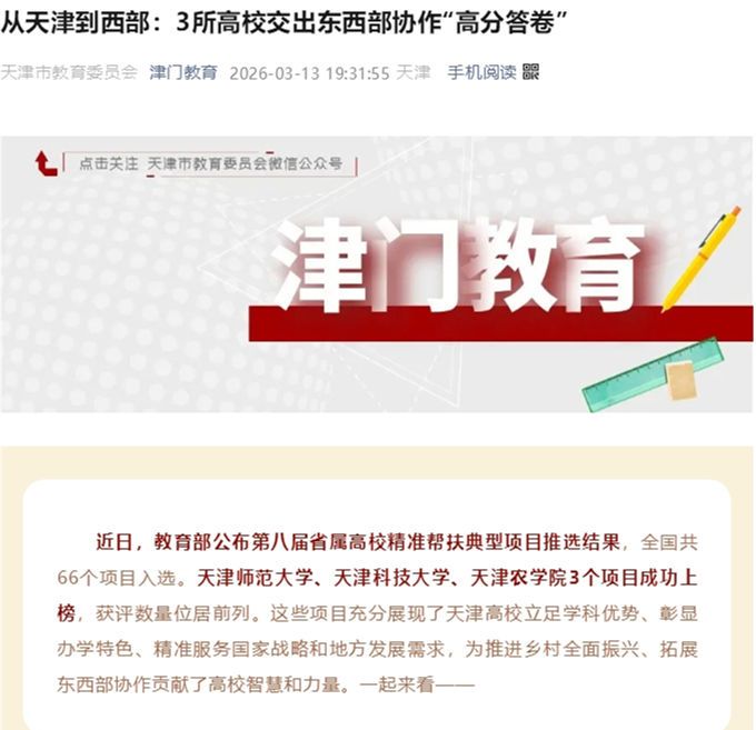 津门教育公众号报道今年会官网报送项目入选教育部公布第八届省属高校精准帮扶典型项目