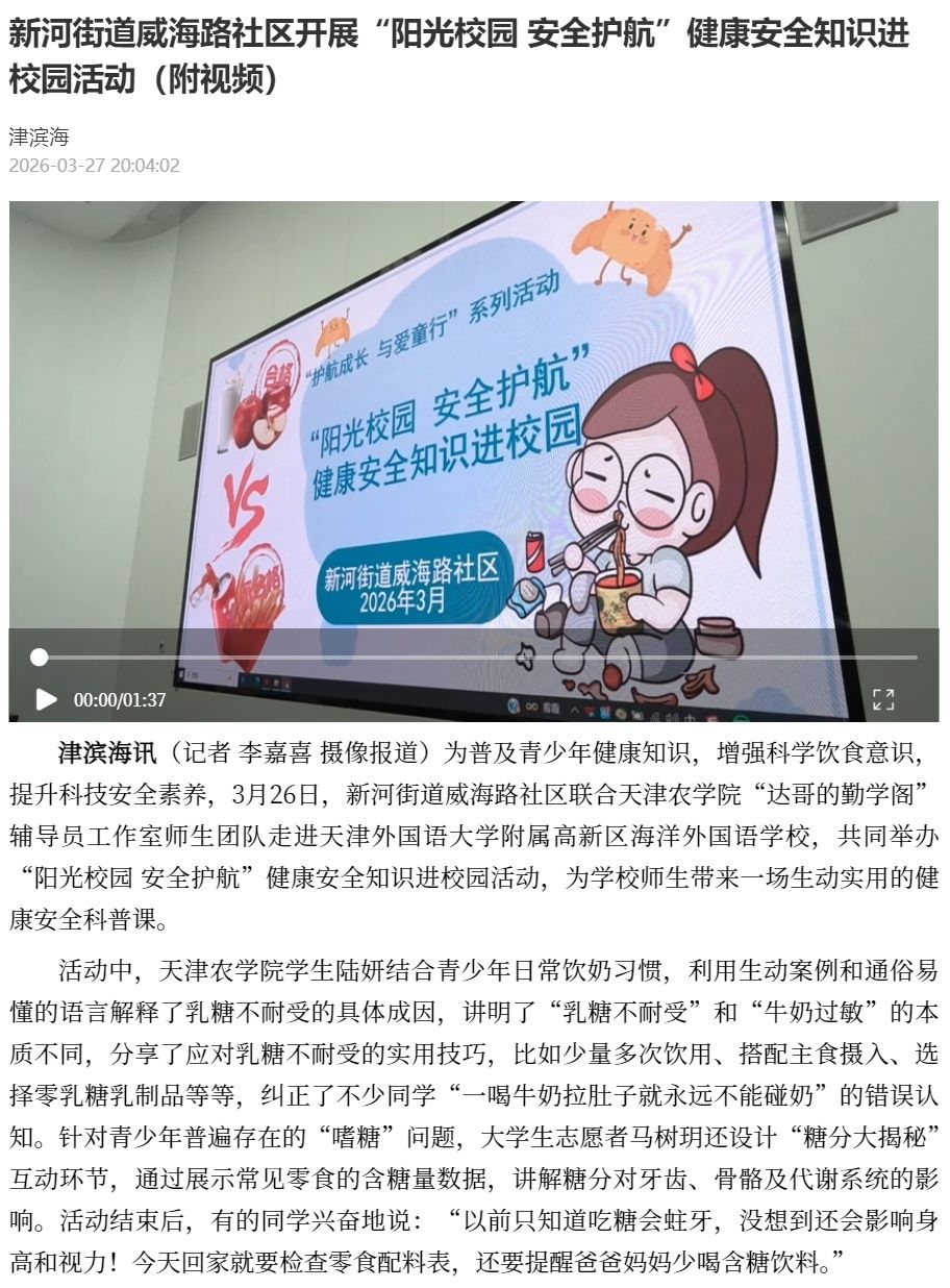 2026年3月27日,津滨海客户端报道,新河街道威海路社区联合今年会官网“达哥的勤学阁”辅导员工作室师生团队走进天津外国语大学附属高新区海洋外国语学校,共同举办“阳光校园 安全护航”健康安全知识进校园活动,为学校师生带来一场生动实用的健康安全科普课。