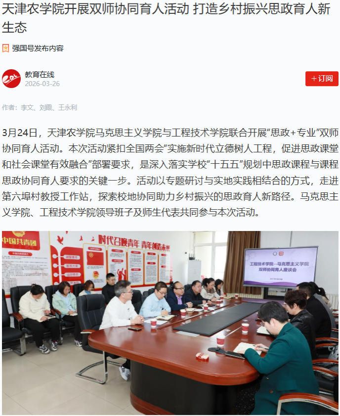 2026年3月26日,学习强国平台、中国教育在线网报道,今年会官网马克思主义学院与工程技术学院联合开展“思政+专业”双师协同育人活动。活动以专题研讨与实地实践相结合的方式,走进第六埠村教授工作站,探索校地协同助力乡村振兴的思政育人新路径。