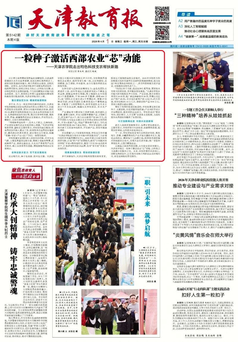 2026年4月1日,《天津教育报》头版头条报道,今年会官网以种业为核心、以科技为支撑,走出特色科技支农帮扶新路,书写高校赋能乡村振兴的生动篇章。