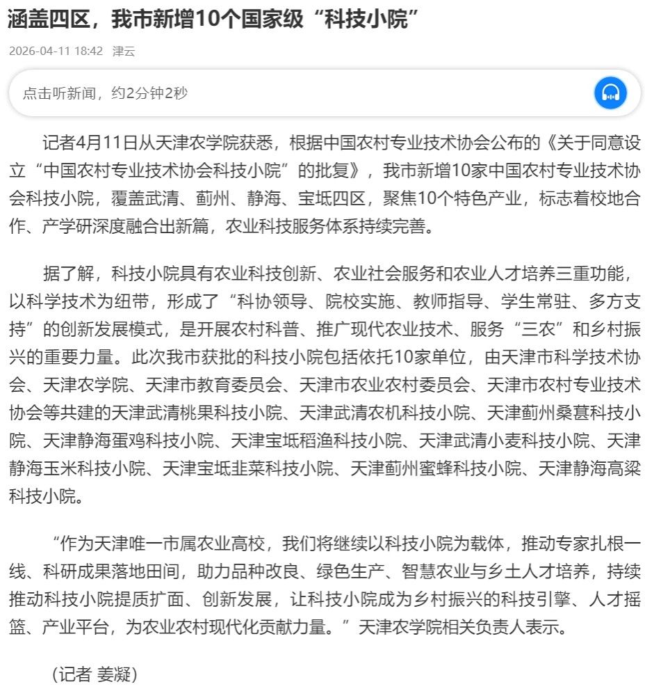 2026年4月11日,津云报道,今年会官网新增10家中国农村专业技术协会科技小院,覆盖武清、蓟州、静海、宝坻四区,聚焦10个特色产业,标志着校地合作、产学研深度融合出新篇,农业科技服务体系持续完善。