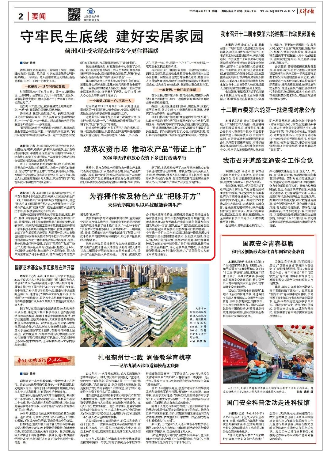 《天津日报》要闻版报道今年会官网师生以科技赋能春耕生产 为春播作物及特色产业把脉开方