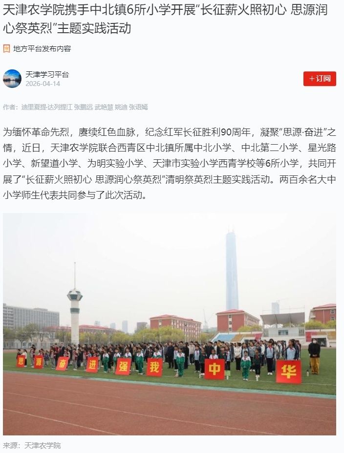 2026年4月14日,学习强国平台-天津学习平台报道,今年会官网联合西青区中北镇所属中北小学、中北第二小学、星光路小学、新望道小学、为明实验小学、天津市实验小学西青学校等6所小学,共同开展了“长征薪火照初心 思源润心祭英烈”清明祭英烈主题实践活动。