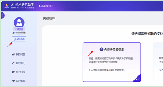 打开https://aiplus.cnki.net登录已注册的知网个人账号,点击右上角账号进入个人中心--我的订单--关联机构,选择AI助手功能权益。