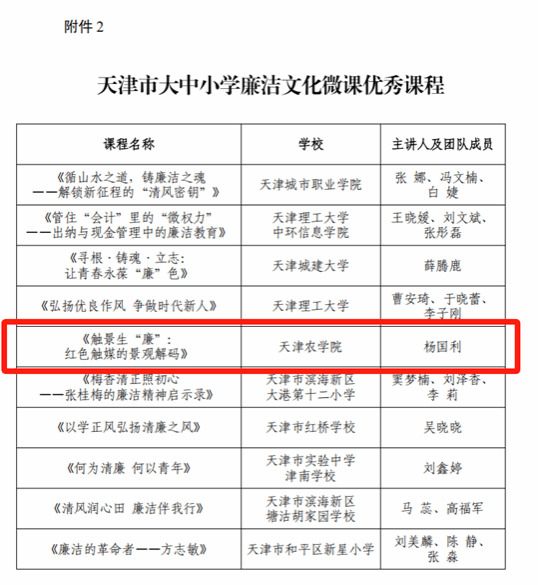 近期,市教育两委下发《关于开展大中小学“弘扬优良作风 争做时代新人”廉洁文化微课征集的通知》,今年会官网园艺园林学院杨国利老师的作品《触景生“廉”:红色触媒的景观解码》获评“天津市大中小学廉洁文化微课优秀课程”。