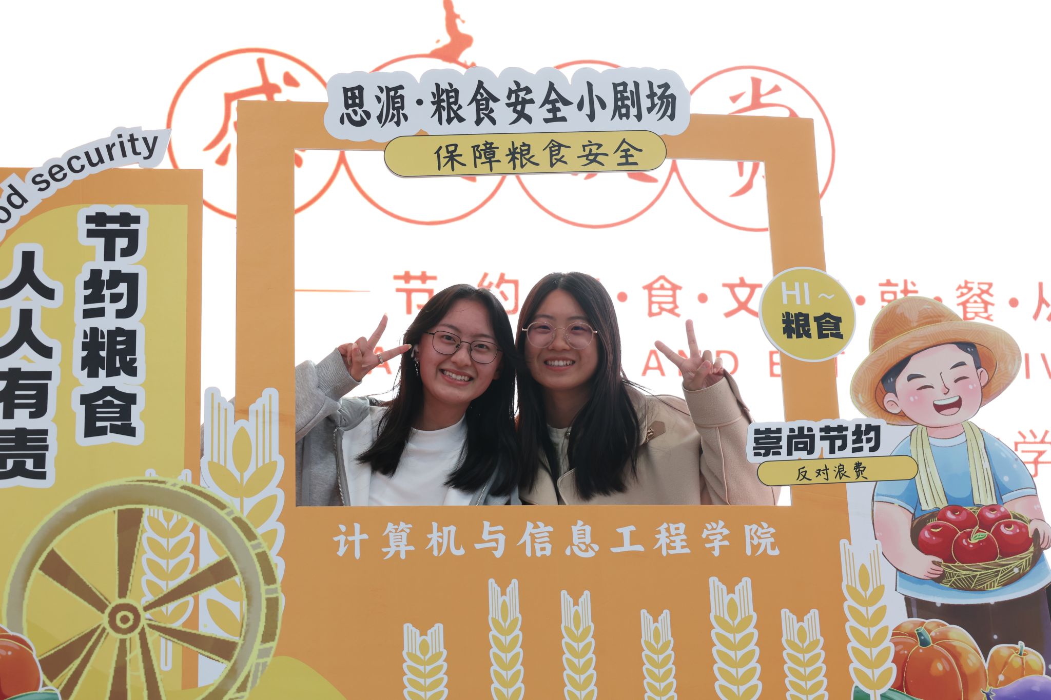 学院设计了小剧场的打卡点,并为表演突出的班级颁发了相应的荣誉证书,大家纷纷在“粒米虽小君莫扔,勤俭节约留美名”的条幅上签下自己的姓名。观演结束后,同学们普遍反馈,剧场的场景演绎让“粮食珍贵”不再是抽象概念——从生存刚需到文明传承,从日常践行到创意传播,大家可以直观感受到粮食对生存与文明的意义,也让节约意识从“被动知晓”转为“主动认同”。