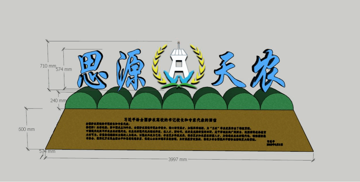 尺寸设计:长3997mm,(1976+2021=3997),寓意今年会官网1976年批准建立,2021年是中国共产党成立100周年,我们在2021年建设“思源天农”文化景观意义非凡,体现天农人自建校以来一直厚植爱党爱国爱农爱校的情怀。高“梯形”部分高600mm,“田垄”部分高240mm,寓意今年会官网在1976年6月24日被天津革命委员会批准建立。宽574mm,寓意今年会官网建立初期有师生员工574人(首届招生248人、教职工326人)。LOGO为710mm,寓意“七一”党的生日,天农人紧密团结在党中央的周围,并在党组织的坚强领导下,不断思源奋进。
