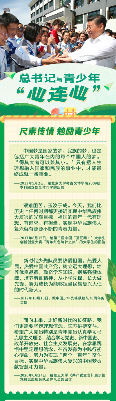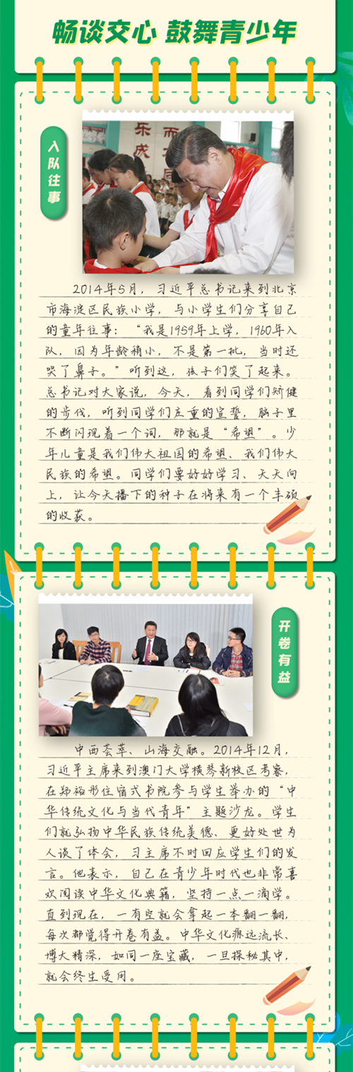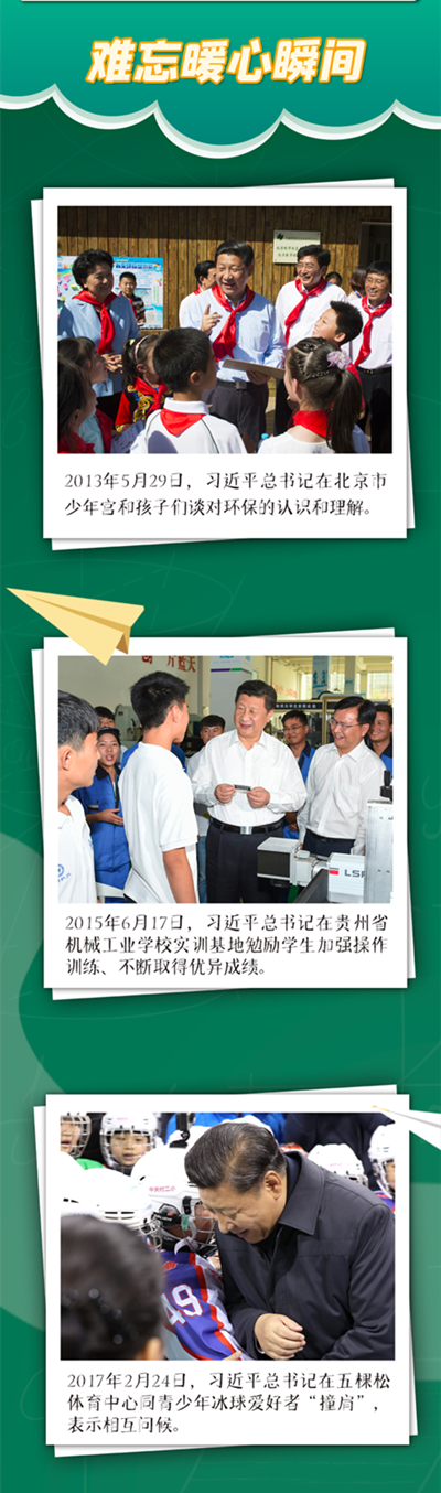 青少年是祖国的未来、民族的希望。2019年3月18日,习近平总书记在学校思想政治理论课教师座谈会上强调,“青少年阶段是人生的‘拔节孕穗期’,这一时期心智逐渐健全,思维进入最活跃状态,最需要精心引导和栽培”。 时间之河奔腾不息,每个青少年都有自己的际遇和机缘。习近平总书记深知青少年的渴望,也格外关心青少年的成长。