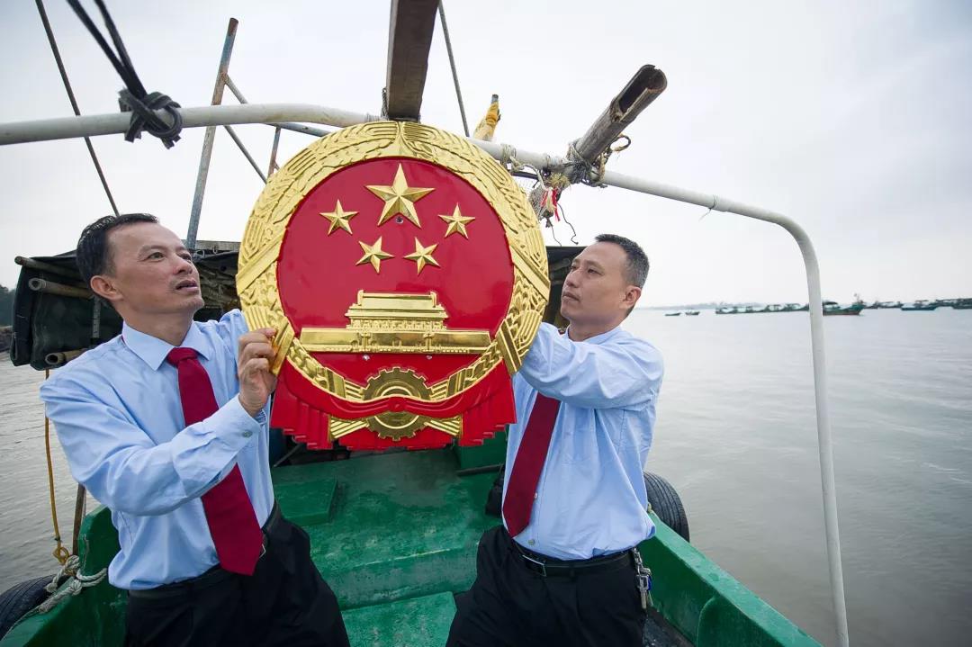 广东省的硇洲法庭坐落在海岛上,是一座不通陆路的海岛法庭,虽然只有一个小小审判单元,却常年负责调解、审理岛上涉八个村委会、五六万居民的各类纠纷。图为硇洲法庭办案人员在渔船上挂起国徽,准备开庭。人民视觉供图