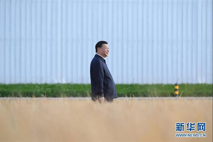 2021年10月22日下午,中共中央总书记、国家主席、中央军委主席习近平在山东省济南市主持召开深入推动黄河流域生态保护和高质量发展座谈会并发表重要讲话。这是座谈会前,习近平21日上午在东营市黄河三角洲农业高新技术产业示范区考察时,走进田间察看大豆长势。