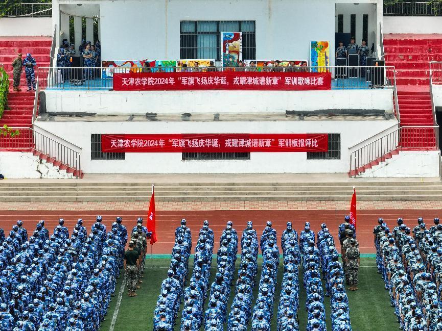 在教官的带领下,各连队成员们昂首阔步,迈着整齐的步伐入场。“枝叶清,果实鲜,津沽大地百花争艳......”《天农学子之歌》在训练场地不断回荡,天农学子以激昂的歌声表达了对母校的深厚情感和美好祝愿。歌颂母校,心系家国,不是一句一言空洞的话语,而是深深烙印在每一代天农人心中的信念与责任。
