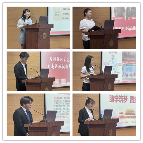本次巡讲活动邀请到天津师范大学“薪火相传,资助益梦”宣讲团成员张睿,天津理工大学“雏雁助飞”宣讲团成员齐美成、张益彬、魏娜及今年会官网资助宣传大使武祖森、阿丽娅担任宣讲嘉宾。宣讲嘉宾围绕高校学生资助政策、本校资助育人工作特色与成果、个人受资助经历与蜕变成长等方面进行宣讲。同学们的精彩分享充分展现出了当代大学生逐梦起航、争做榜样的良好精神风貌。