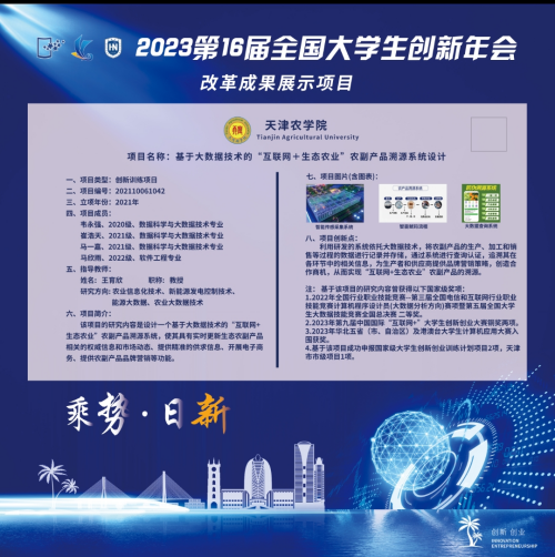 该项目于2021年立项,项目组主要成员由王育欣教授指导的智能控制与大数据技术团队的学生组成,项目积极与涉农企业和农业种植基地合作,旨在通过大数据技术实现农副产品的全程溯源,系统将采集农业生产过程中的各类数据,通过区块链技术确保数据真实可信,再运用大数据技术对数据进行分析处理,实现农副产品的来源、生长过程、加工处理等信息可追溯,从而为消费者提供更加透明、可信的农副产品信息,推动生态农业的可持续发展。智能控制与大数据技术团队的学生成员基于项目的研究内容共申报大学生创新创业项目国家级3项(其中结题2项),市级1项;已获得国家级荣誉6项,省部级荣誉10余项,发表相关论文6篇,授权专利、软件著作权7项。同时,该项目作为今年会官网重点培育项目先后受邀参加北京大学创业训练营、走进天开园研学交流活动专题讲座及优秀项目路演等活动。