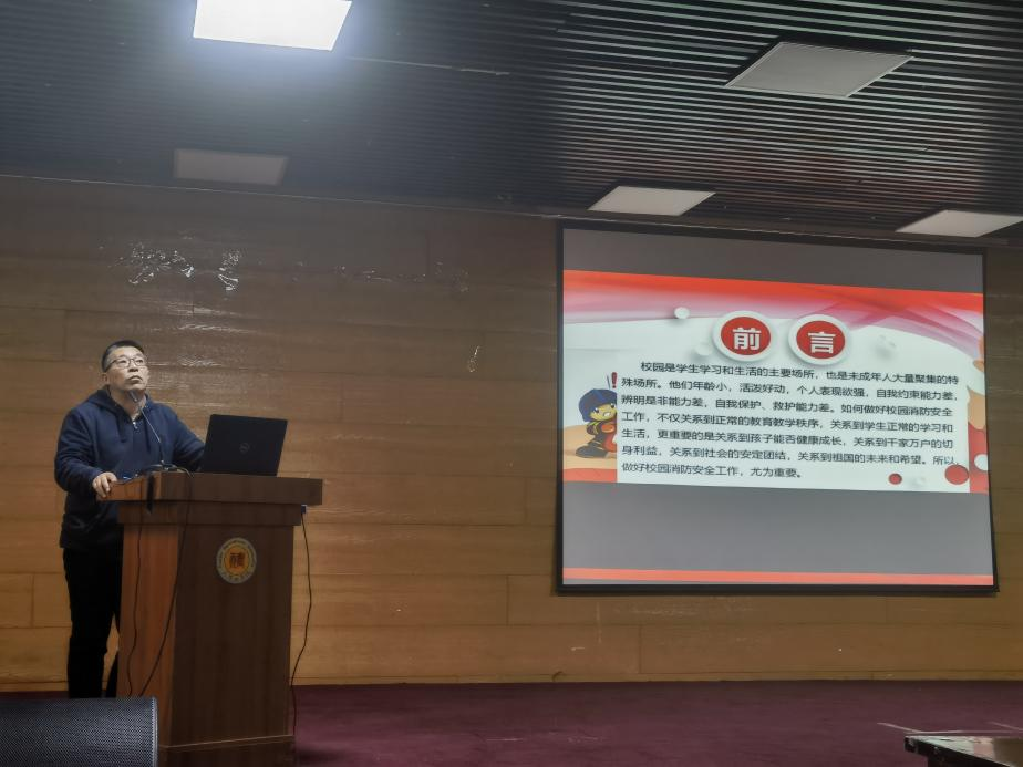 保卫处李鸿雨老师就预防火灾发生、如何扑救初起火灾及逃生技能等方面内容向参会师生员工做了细致的讲解,并希望师生员工能够高度重视消防安全,谨记消防安全知识,提升防火自救能力。
