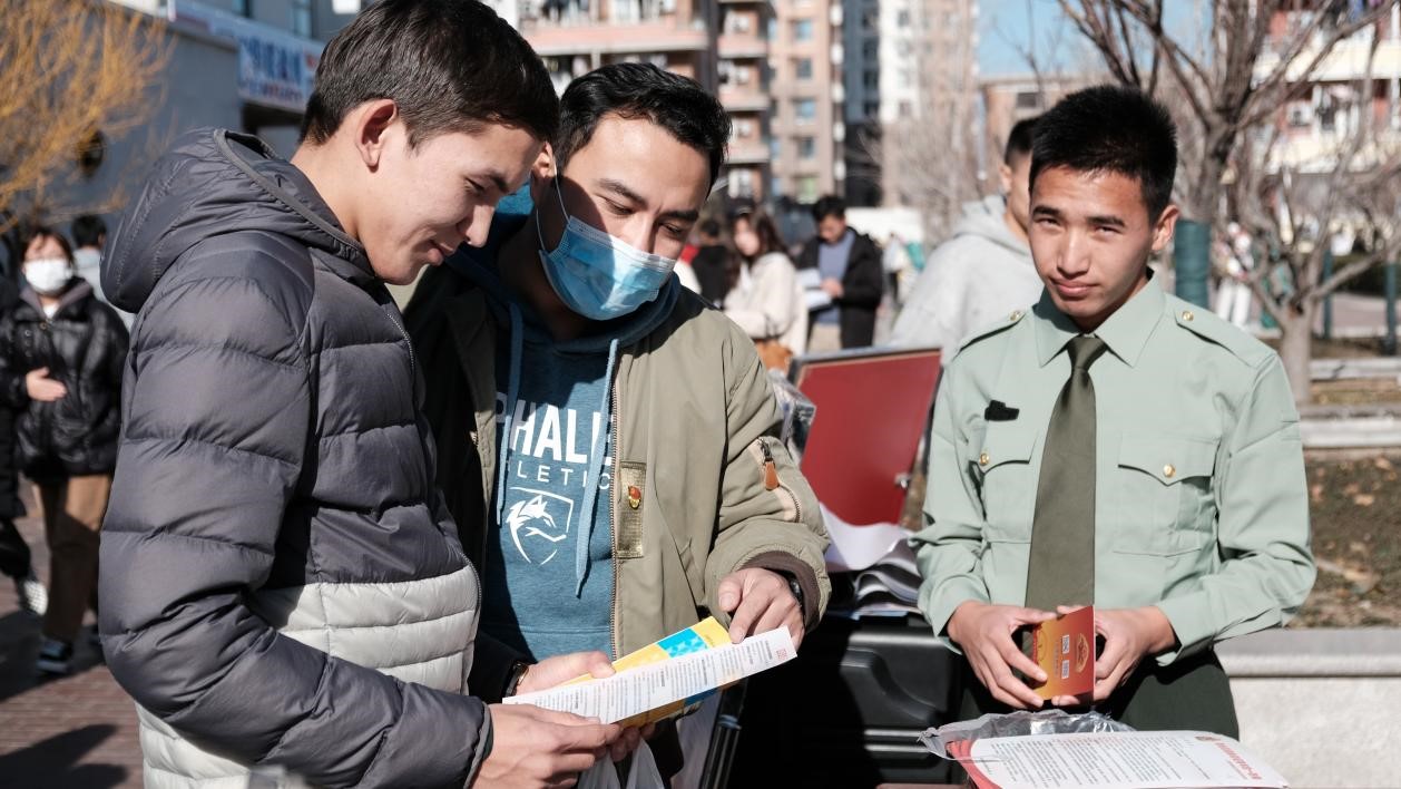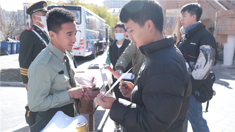 11月24日至12月1日,在东西两校区征兵宣传现场,激昂嘹亮的军歌回荡在天农校园,有志学子怀着激动的心情来到宣传现场前来咨询。在校武装部老师的带领下,由兵源预储班同学组成的征兵宣传组热情为前来咨询的同学发放征兵政策宣传单。