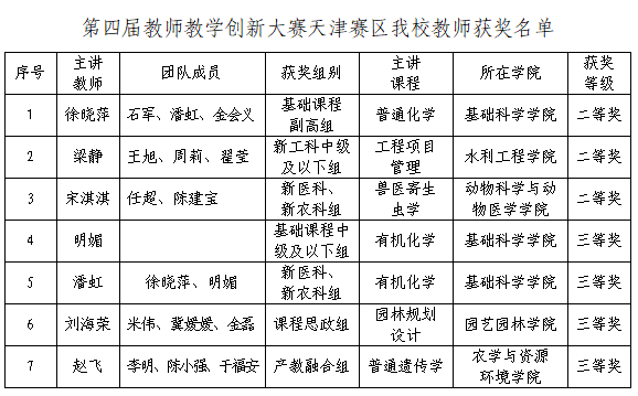 近日,天津市教委公布了第四届全国高校教师教学创新大赛天津赛区比赛获奖名单。今年会官网基础科学学院教师徐晓萍、水利工程学院教师梁静、动物科学与动物医学学院教师宋淇淇带领其团队,凭借扎实的教学基础和良好的教育素养,荣获市赛二等奖;基础科学学院教师明媚、潘虹,园艺园林学院教师刘海荣、农学与资源环境学院教师赵飞带领其团队荣获三等奖。