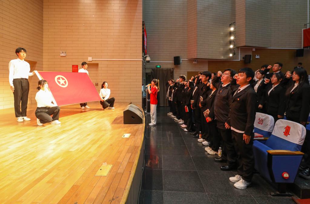 在庄严的入团仪式中,老团员代表为新团员佩戴团徽,并赠予书籍《习近平与大学生朋友们》,号召新团员感悟思想伟力,淬炼理想信念。新团员面向团旗庄严宣誓,铿锵有力的誓言展示了团员青年良好精神风貌,激励了现场每位团员青年的心。