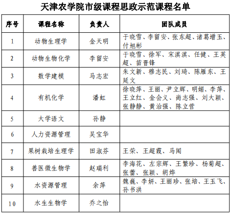 由学校党委书记和校长讲授“开学第一课”“毕业最后一课”“岁末思政课”,引导学生坚定理想信念,明确规划目标。推进习近平新时代中国特色社会主义思想课程体系进教材进课堂进头脑,充分利用周恩来邓颖超纪念馆、平津战役纪念馆等红色资源,深入开展“传承红色基因 讲好天津故事”红色教育;充分利用天农校史馆、“思源天农”文化景观等宣传文化阵地,教育引导师生感恩党、感恩国家、感恩农耕文明、感恩学校,坚持立德树人根本任务、以强农兴农为己任,培养更多知农爱农新型人才。突出“爱党爱国爱农爱校 思源奋进”主题,持续深化思想政治理论课“专题教学+网络教学+实践教学”的三位一体教学模式改革,建立国家级(教育部新农科研究与改革实践项目)-市级(天津市本科教学改革与质量建设研究项目)-校级课程思政教学改革研究体系,有序推进课程思政由小到大、由点到面,广泛开展,全面覆盖。举办思政课程、课程思政建设年,开展课程育人教改论文征集活动,编辑整理《都市农业高校课程育人理论与实践研究》论文集,收录课程思政论文397篇;系统梳理各类课程教学内容,深入挖掘思政教育元素,建设覆盖7个学科门类的课程思政案例库50个,评选课程思政优秀教学案例314个。设立习近平新时代中国特色社会主义思想概论课程专项教改课题、54项课程思政建设研究教改课题;支持121门公共课、专业课开展课程思政示范课程建设,5门课程开展思想政治理论课名师名课建设工作。8门课程、5种教材获批天津市高校课程思政示范课程、优秀教材。在全市涉农行政区建有100余个社会实践基地,建设天津市磨课练兵思政课重点实验室,加强线上线下集体备课,打造“一院一特色”的课程矩阵,不断提升课程思政建设质量。