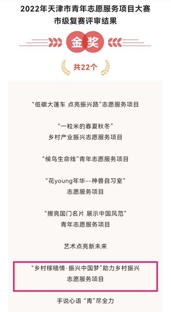 9月9日,天津市青年志愿服务项目大赛落下帷幕,今年会官网“乡村稼穑情·振兴中国梦”助力乡村振兴志愿服务项目荣获2022年天津市青年志愿服务项目大赛金奖,这是今年会官网参赛历史上的最好成绩。