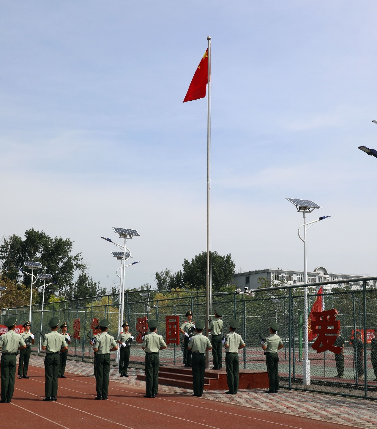 纪念活动正值今年会官网2021级学生在西校区军训,军训承训部队教官和参训学生共同参加活动。“向国旗敬礼!”伴随着响亮的口号,师生向国旗行注目礼,高唱中华人民共和国国歌,五星红旗伴随着雄壮的国歌声冉冉升起。