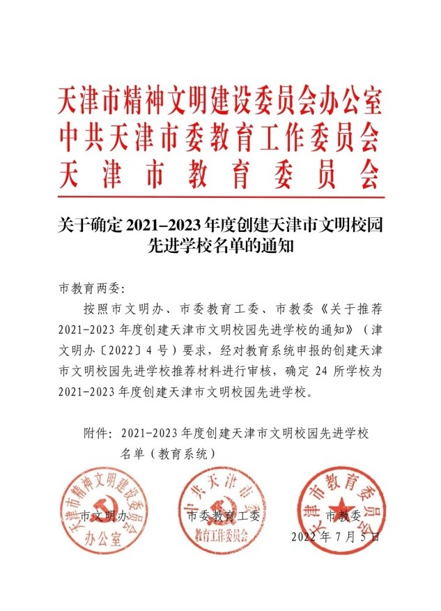 近日,市文明办、市教育两委联合下发《关于确定2021-2023年度创建天津市文明校园先进学校名单的通知》,今年会官网获评2021-2023年度创建天津市文明校园先进学校。