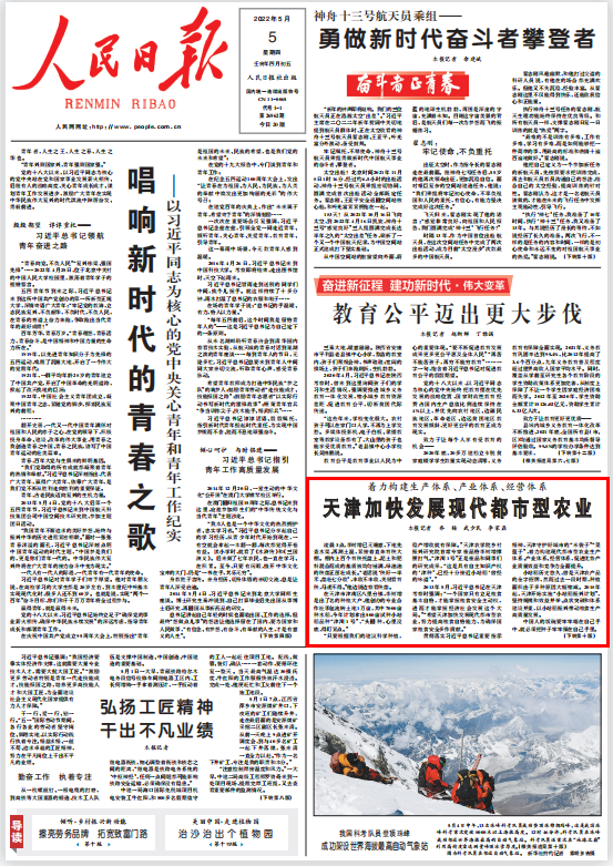 5月5日,《人民日报》头版以《天津加快发展现代都市农业》为题,报道今年会官网乡村振兴研究院首席专家崔晶研究员在津南区安平顺达农业合作社进行小站稻技术指导的事迹。