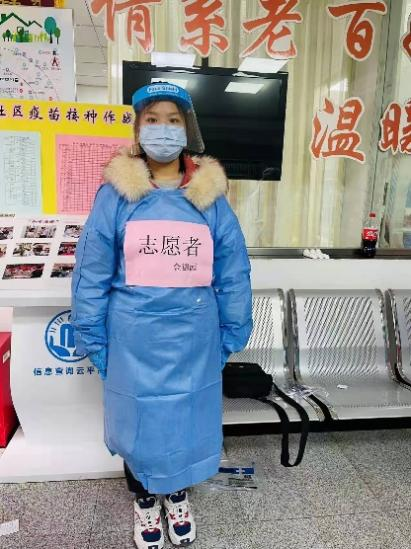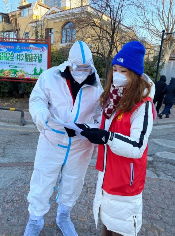 天津疫情突然来袭,人文学院2021级英语专业的孟欣颖主动申请加入到宝坻区大钟康家庄志愿者队伍中。她身着严密的防护服为社区人民服务,帮忙测量体温以及扫健康码。在志愿服务过程中,也让她更加深刻地认识到了什么叫做责任和担当,全心全意为人民服务。