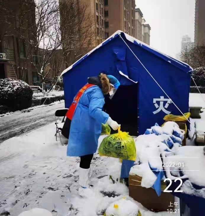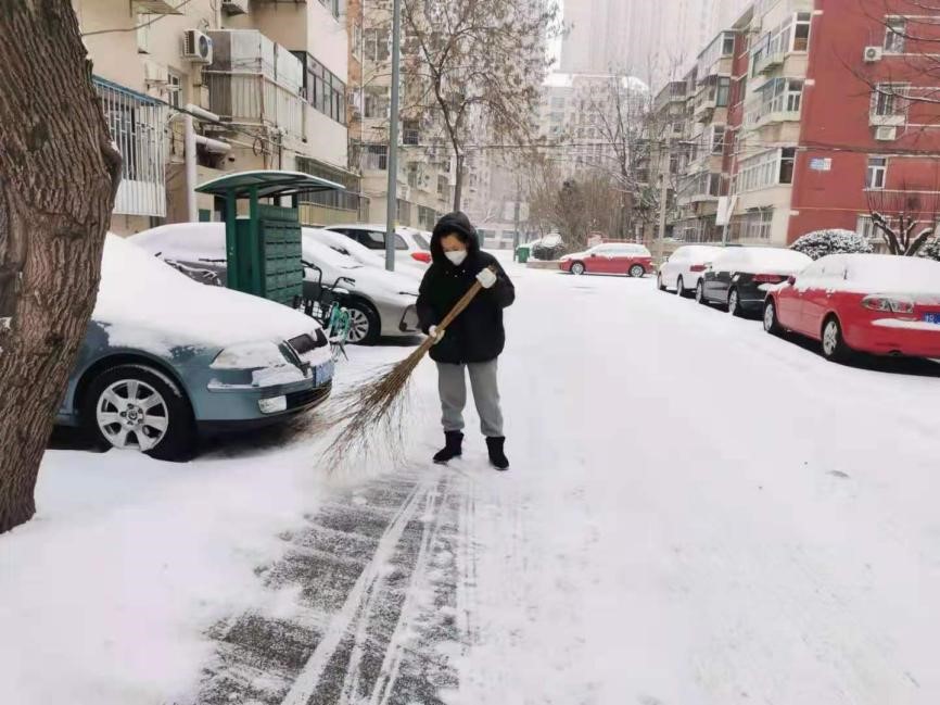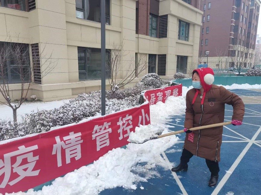 居住在疫情管控区的教师党员在社区清扫积雪,畅通社区道路