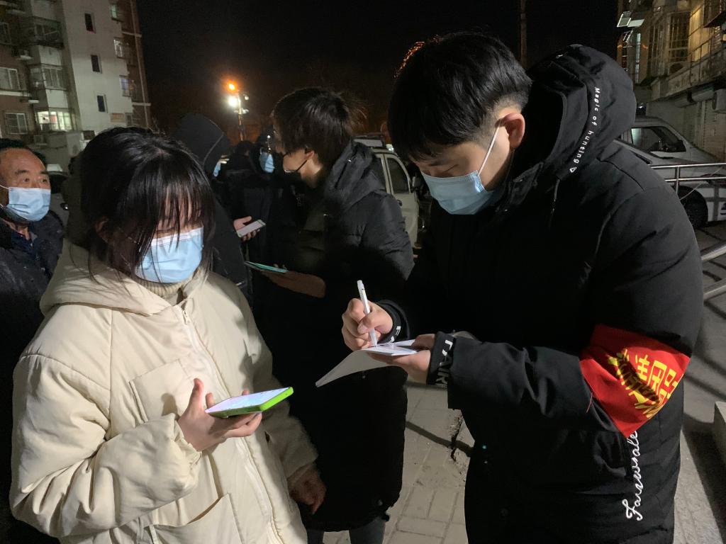 经过沟通,志愿者们分为两组进行轮班。孙学健同学从下午开始便在核酸检测点做志愿者,负责秩序维护、防疫宣传。他按照要求安排引导居民排队,10人一组混检核酸,一直持续到凌晨2点多。“后来,我也数不清一共引导了多少组居民,我第一次意识到我们所在的社区竟然有这么多居民!”