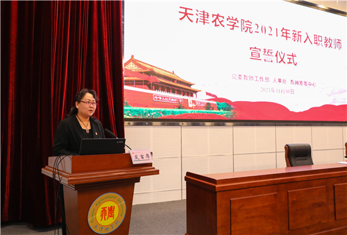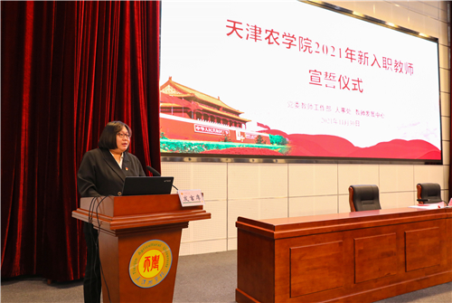 在党委教师工作部部长刘铁玲的领誓下,新入职教师面对国旗、校旗庄严宣誓。国务院政府特殊津贴专家、园艺园林学院田淑芬研究员作为专家代表发言,经济管理学院杨欣教授作为新入职教师代表发言。